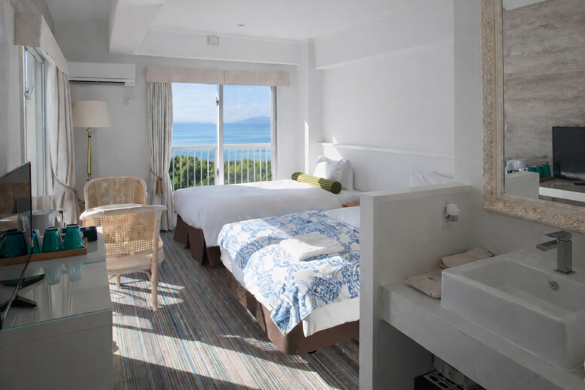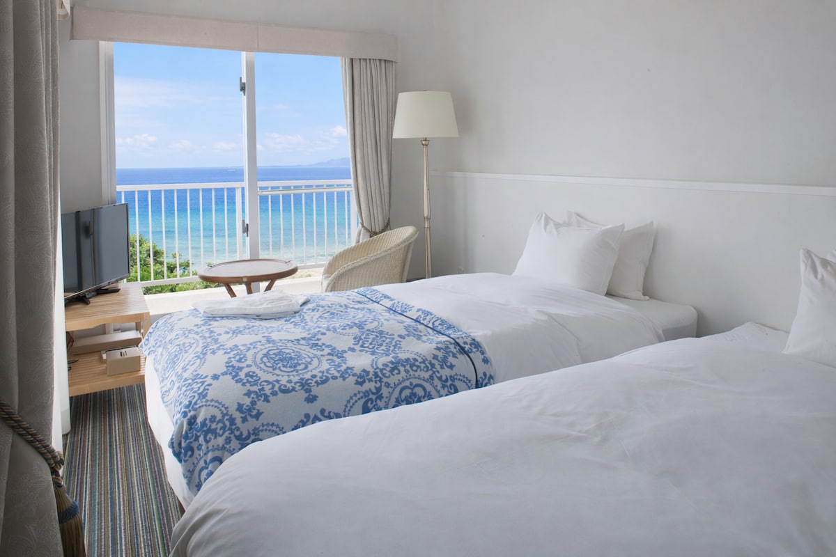 独享眼前一望无际的大海,配有按摩浴缸的角落双床房!美丽海滩201号房