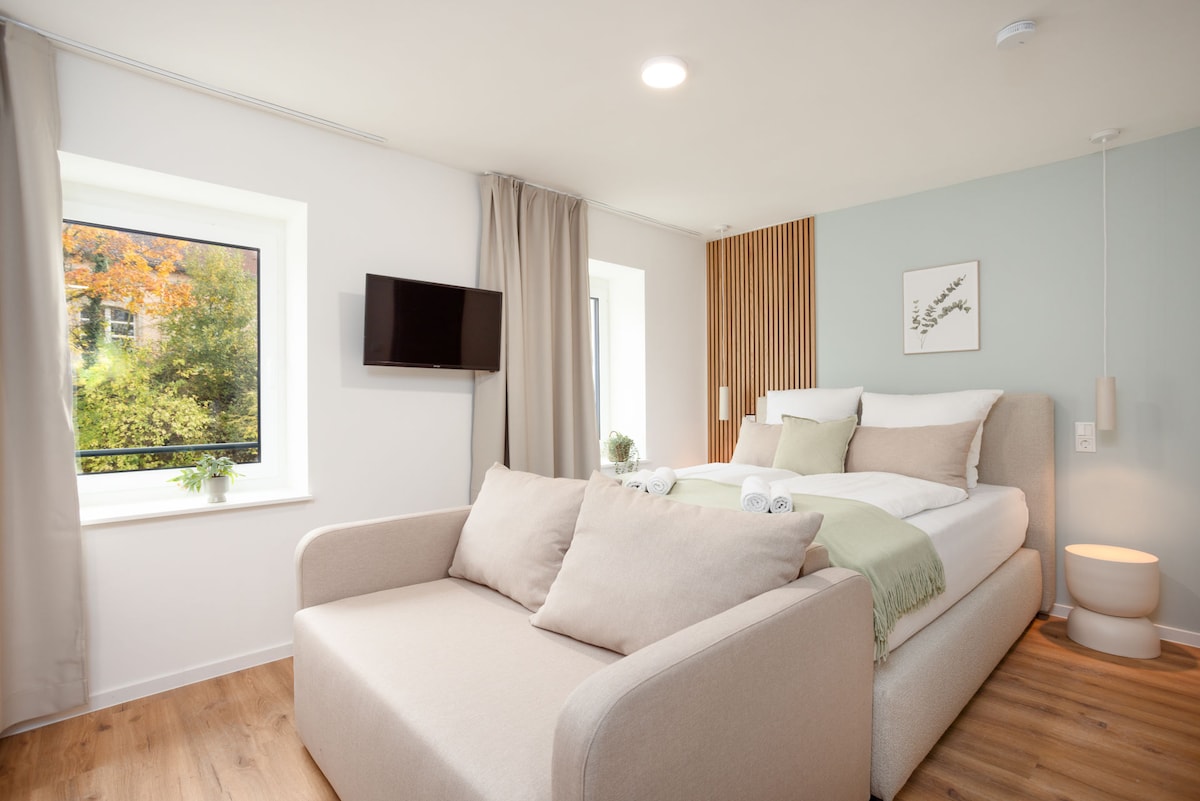 Traumhaftes Balkon-Apartment in einer hervorragender Randstadtlage in Fulda. Bei der komplett neuen Ausstattung wurde Wert auf höchste Qualität gelegt: Hochwertigste LED-Beleuchtung, sämtliche Fenster-Rollläden elektrisch, in jedem Raum Fußbodenheizung. Eine Top Moderne Küche. LED-Flach-Fernseher (Smart-TV, 65-Zoll) Großes Boxspringbett mit First-Class Matratzen inkl. Topper und ein Schlaf-Sofa.