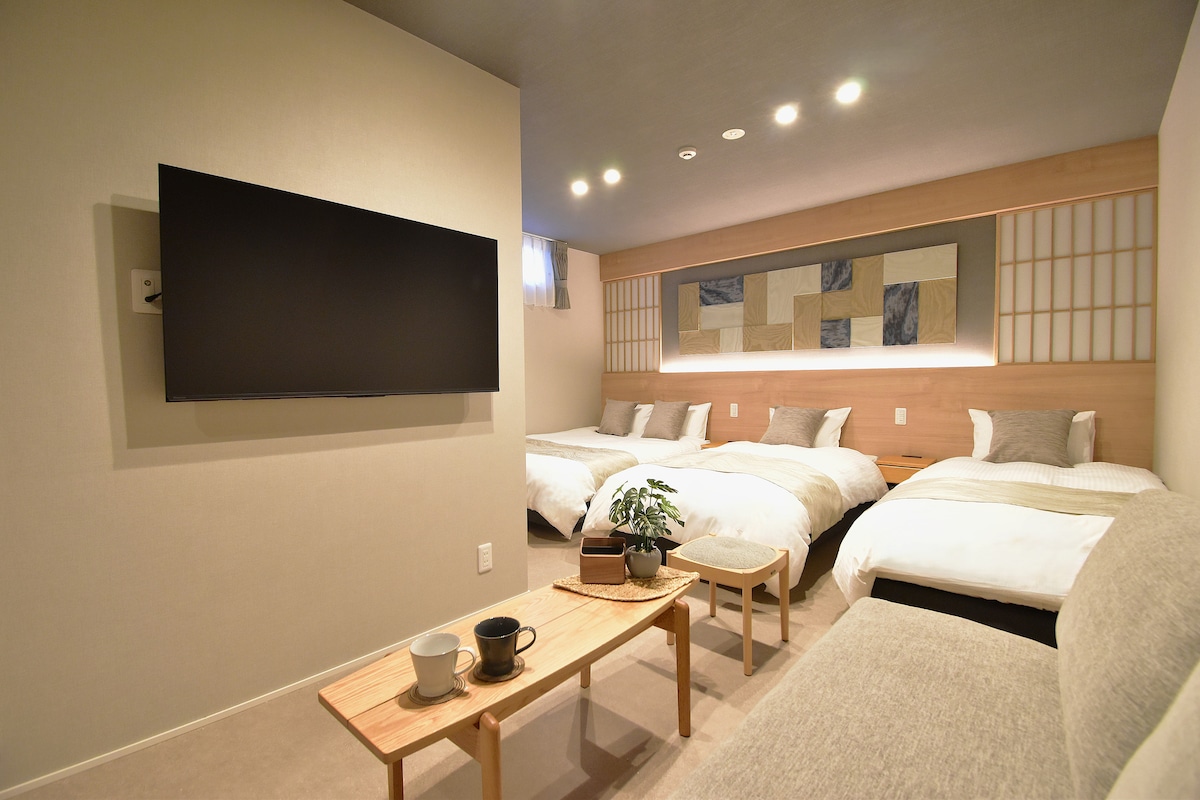 【禁煙】 [階数] 6階 [広さ] 180平米 [ベッドタイプ]キングベッド × 2台 セミダブル × 2台 セミダブル × 2台 ■バスルーム ■Wi-Fiネットワーク(無料) 〇今治バスタオル、今治ハンドタオル、今治ガウン 〇ReFaシャワーヘッド、KINUJOドライヤー&アイロン 〇ReFaシャンプー、ReFaコンディショナー 〇ボディソープ、クレンジング、洗顔料 〇歯ブラシ、シェーバー、コーム、綿棒コットン、ソープ 〇スリッパ、ヘアキャップ、ヘアゴム 〇無料ドリンク 〇コーヒーメーカー