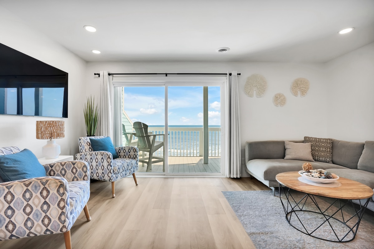 Charming 3 bed, 2 bath top level, ocean-front condo. Enjoy your coffee (or mimosas) on the oversized deck, soaking up the sun and taking in all that this private beach has to offer. For a closer look at the dolphins swimming by or the fisherman’s daily catch, you’re just a short walk to the sand from your door. Spend your days at the beach and your nights being soothed to sleep by the sound of the waves from your home. No matter the time of day or year, let Ocean Sounds calm you.