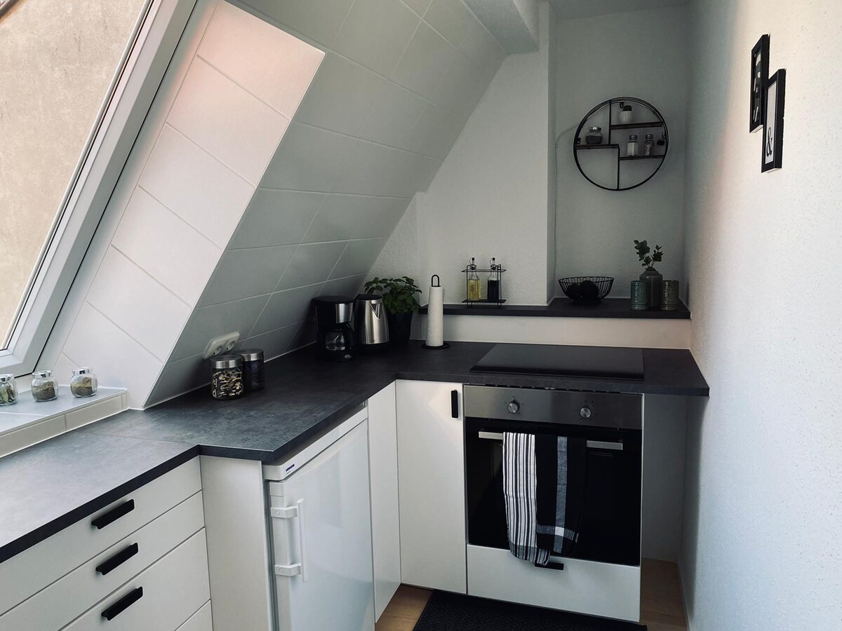 Das Apartment befindet sich in der 4 Etage eines Altbaus aus dem Jahr 1909 mit Blick auf die Dächer der Schweinfurter Altstadt. In dieser 40m² großen Dachwohnung mit ausgebautem Giebel und freiem Ausblick fühlt man sich sofort wie Zuhause. Es verfügt über alles was es für einen längeren Aufenthalt oder für Wohnen auf Zeit nötig ist. Es verfügt über ein Bad mit Dusche und eine brandneue voll ausgestattete, offene Küche mit Kühlschrank, Kaffeemaschine, Toaster, Wasserkocher, Herd und Geschirr.