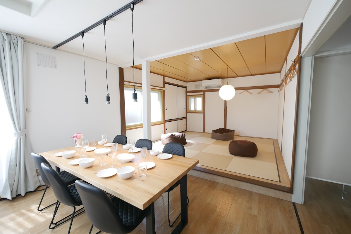 駐車場無料の貸切住宅。移動に便利な立地なので観光の「base camp」に最適。