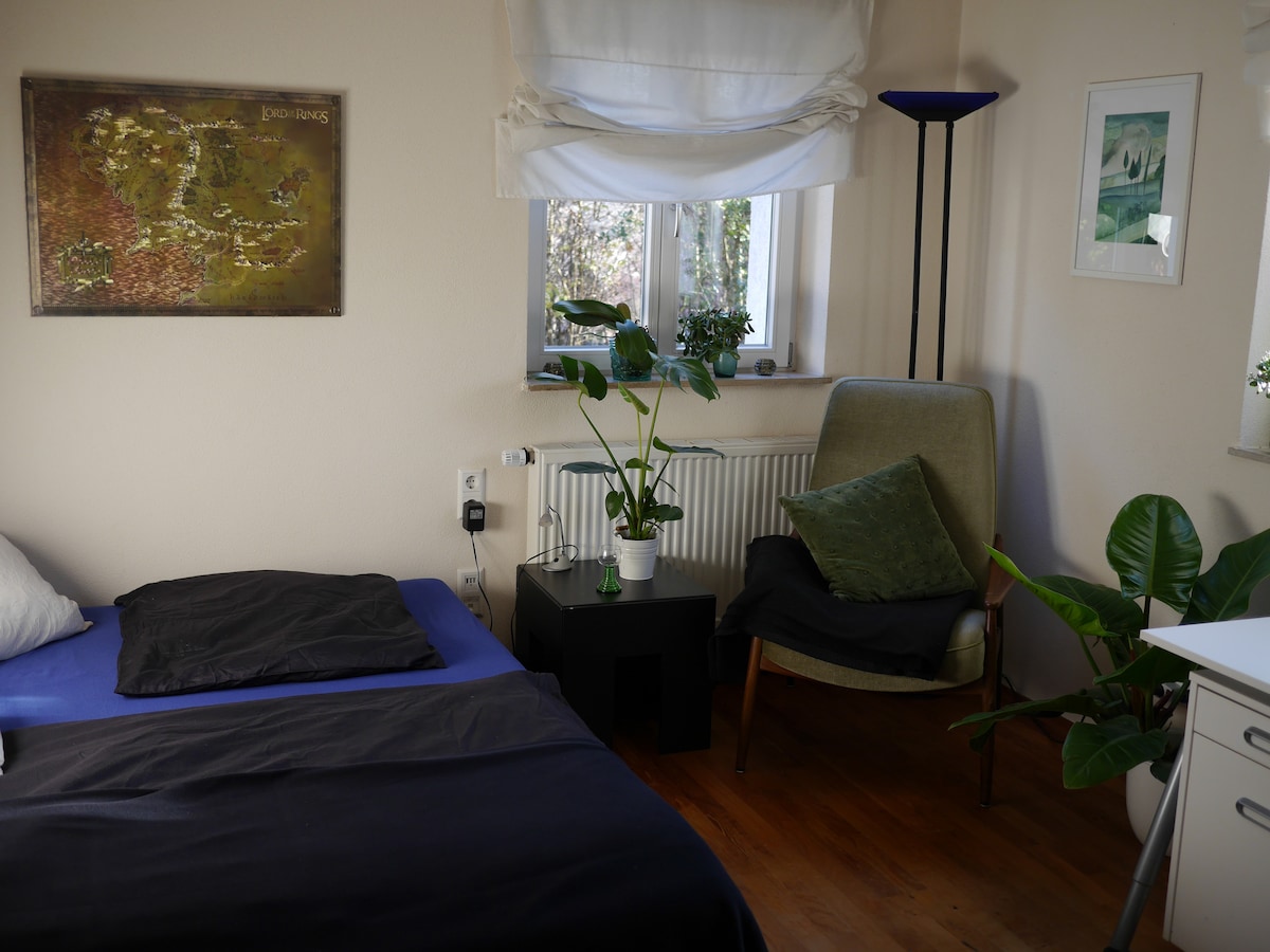 Diese ruhige und helle Wohnung mit eigenem Eingang befindet sich im Souterrain unseres Einfamilienhauses. Neben dem Flur und Bad besticht das Hauptzimmer mit einer charmanten Aufteilung: Die Barhocker laden zum gemütlichen Beisammensein ein, die moderne Küchenzeile wartet auf eure Kochkünste und der stilvoll abgetrennte Schlafbereich mit Doppelbett (160x200) und TV runden das Zimmer ab. Weitere Highlights: Stellplatz vor der Tür, Bushaltestelle in 2 min, viel Stauraum, Highspeed-WLAN