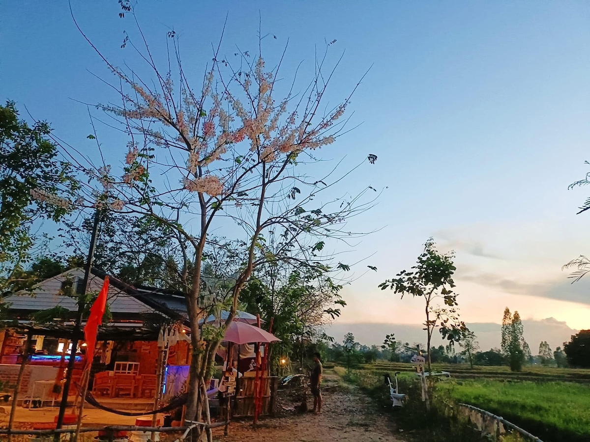 citue dans vrai petit village thai a 45 km de khon kaen ou vous trouverais presque tous pour manger et dans le terrain ananas noix de coco mangue etc pour les amoureux de la nature vous serais seule au milieux des rizieres avec une petite riviere qui longe le terrain avec une grande terrasse sur un plan d eau ideal pour pecheur avec le soir couche du soleil rouge depuis la terrasse et du cote de la chambre leve le matin sur place je peut vous louer un scooter