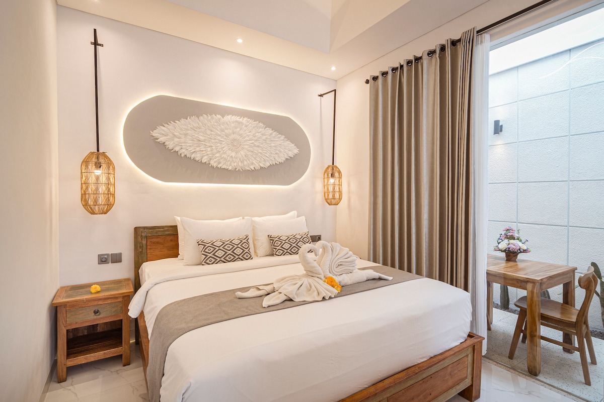 This stylish place to stay is perfect for couple. Escape to the tranquility and modern elegance of our luxurious 1-bedroom villa nestled in the heart of Legian, Bali. Designed for discerning travelers seeking both comfort and style, our villa offers a serene sanctuary where every detail is crafted to enhance your stay. Step into a spacious living area adorned and enjoy the convenience of a fully equipped kitchenette. Retreat to the privacy of your bedroom, complete with a plush king-sized bed.
