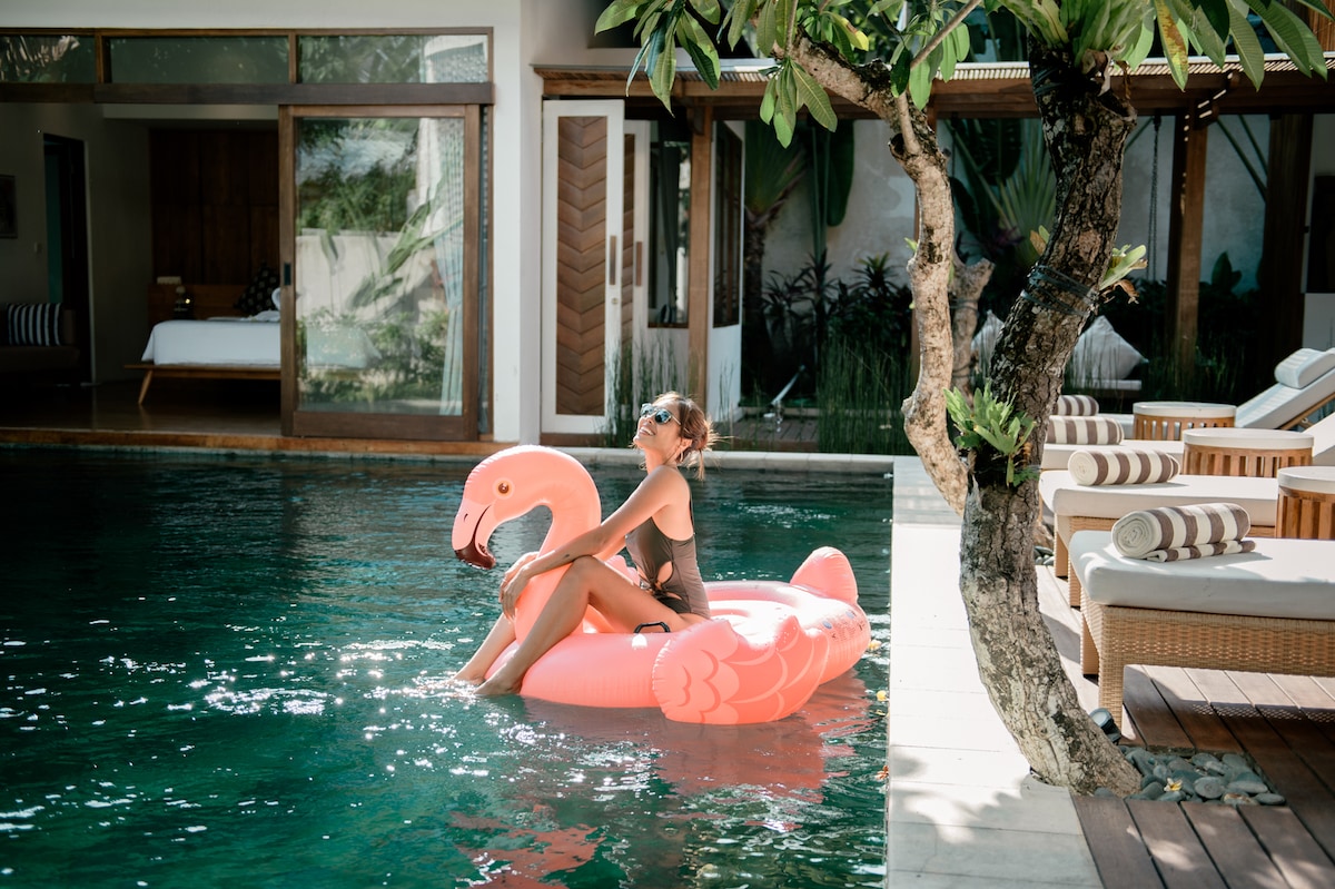 Villa Balu is a quiet little oasis with great interior design and a fantastic tropical garden in one of Bali's most famous area Perfect location (walking distance to the 66 beach, restaurants, supermarket) Free scooter included Bathrooms with bathtub Fully equipped kitchen Fast fiber optic internet 60'' TV, Samsung sound system Smartphone with a local sim card and 4G internet at your disposal 300m2 of land, Car park Daily house cleaning included 6 days a week Unlimited free water gallon