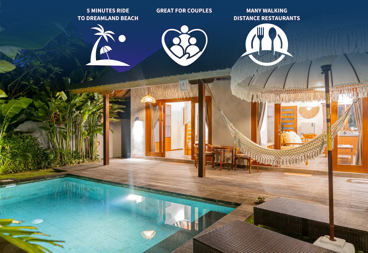** Our staff is FULLY vaccinated and we strictly follow the airbnb covid protocol ** -Perfect one bedroom villa for romantic time -Private swimming pool -Great location of the main road at 200m from restaurants and spas -Beautiful Padma Beach (white sand) is at 950m -Perfect romantic getaway -Breakfast On request // Not included // extra 50k IDR + groceries cost -One extra bed on request