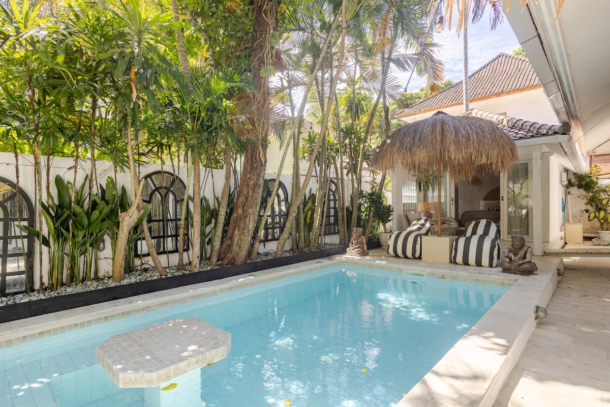 Situated in a quiet private gang in the heart of Canggu, 600 meters from the beach, walking distance to gyms, cafes, padel courts, spas, shops, clubs and world infamous shortcut, this 2 bedrooms Villa offers an enclosed living room and kitchen, a patio overlooking the pool and its magical garden, 2 bedrooms each with its own private outdoor bathroom. A/C and fast wifi available in all rooms.