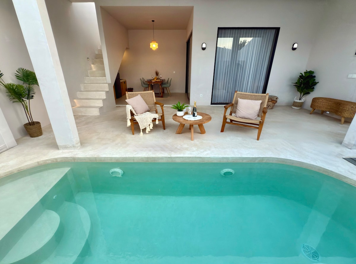 Located in a quiet and elevated area of Canggu, the villa is flood-free, even during the rainy season. A beautifully designed 2-bedroom villa that blends modern Mediterranean style with lush tropical vibes. Located in a peaceful part of Canggu, the villa is just 10 minutes from the beach and only 5 minutes to Nirvana Life, local cafés, and boutique shops. Come with your loved one, bring your friends, or spend quality time with family, the villa’s designed for easy, enjoyable stays!