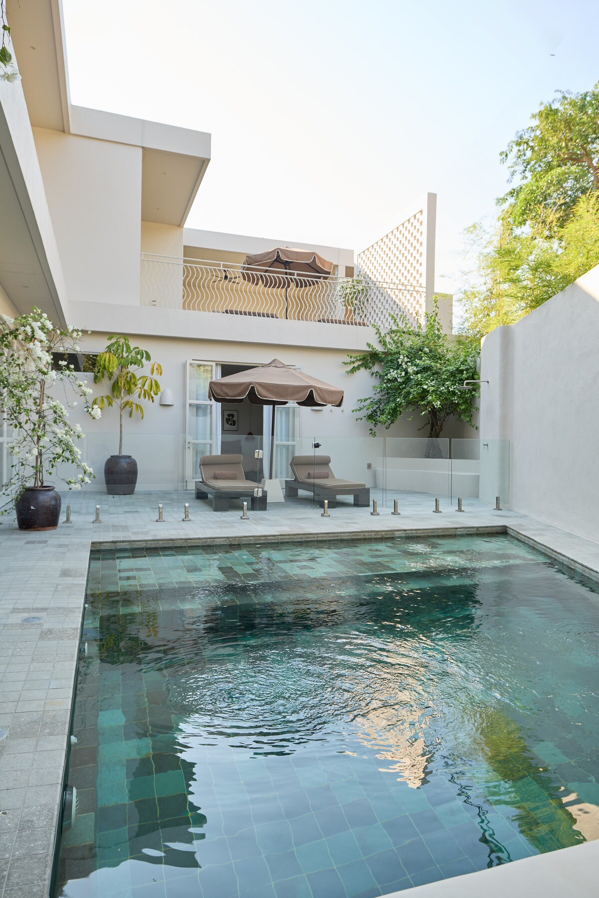 3 ensuite room villa - perfect for families or groups who value design and privacy. Inspired by a New York City townhouse, the villa blends striking glass-block architecture with airy interiors and plenty of natural light. Relax in your private pool with jacuzzi, soak up in the sun on the terrace with beach views and infra sauna or enjoy cozy movie nights. With a vibrant neighborhood just outside your door and everything you need inside, this villa is the ideal setting for a truly memorable stay