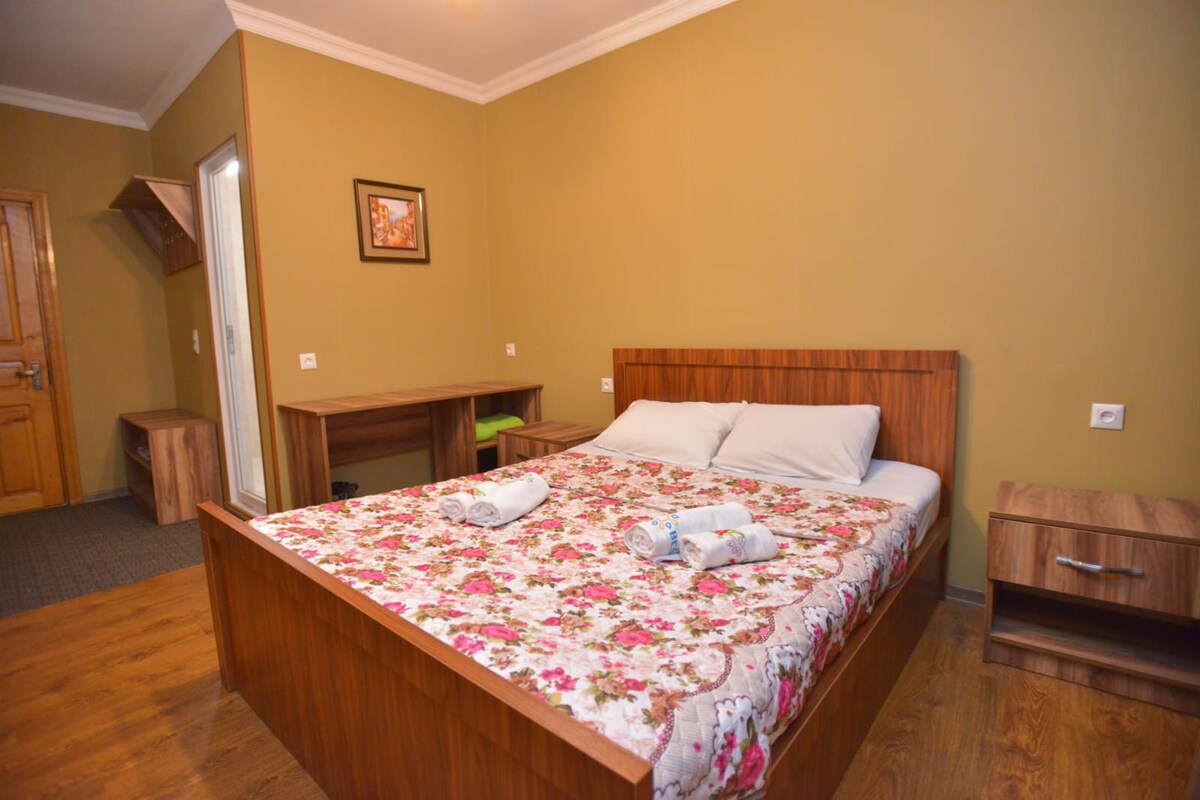 Хорошее отопление зимой и кондиционирование летом. Свой санузел в комнате, рабочее место, шкаф и телевизор. Всего 3 комнаты на этаже. Стабильный и быстрый интернет. Общая миникухня на вашем этаже: микроволновка, чайник, холодильник, посуда. Большой балкон на вашем третьем этаже с видом на горы и стадион. В пешей доступности огромный рынок, автовокзал, парк, бассейн и стадион.