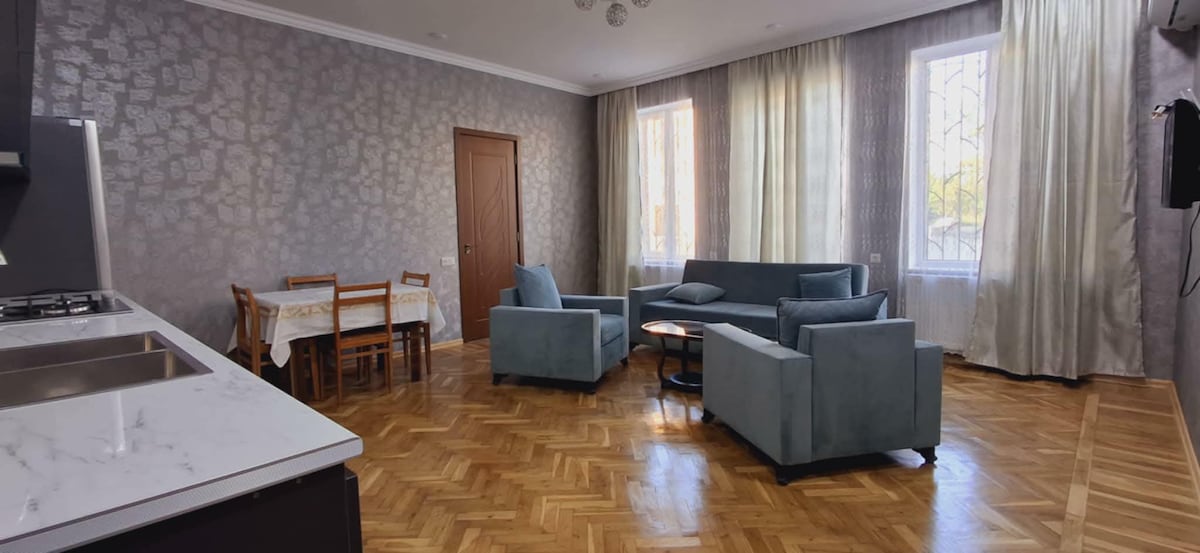 This unique space is located in the very heart of Old Kutaisi, just a few steps from the city center. Its modern design and rich list of amenities will meet all your needs: 2 comfortable queen-size beds, fresh towels and bed linens, a cozy sofa with pillows, a fully equipped kitchen for self-catering, a smart TV, high-speed Wi-Fi, air conditioning, a washing machine, and complimentary coffee and tea. So relax, unwind and make yourself at home🏠 🚭 No smoking indoors 🐾 No pets allowed