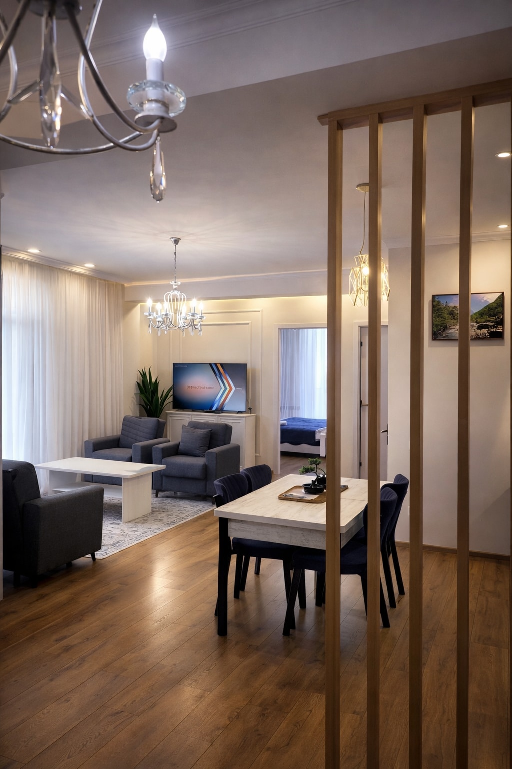 The apartment is in the city center,The best location in Kutaisi. It has two bedrooms(A large bed in both),Living room, kitchen,bathroom and a large yard.The yard is protected by security cameras.,You can park your car in the yard.The apartment can accommodate 5 people(The sofa in the living room collapses).Everything is just for you. There is central heating and air conditioning.