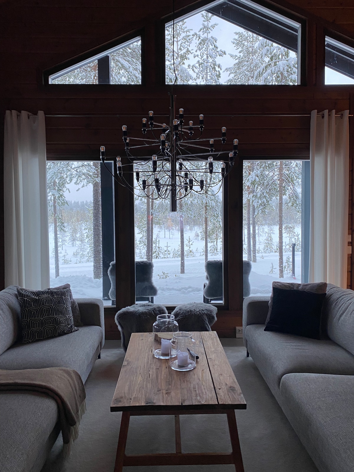 This luxury chalet offers unobstructed stunning views for miles over arctic wilderness. Just step outside and enjoy jacuzzi in a private, yet sunny south facing patio. Ruka Twin Borealis is modern fully equipped 3 bedroom chalet close to the action of Ruka village yet offering peaceful views over breathtaking nature that literally comes in through the large living room windows. Amenities include sauna, jacuzzi, EV charging, air conditioning and spacious car port. Ig: rukalodges