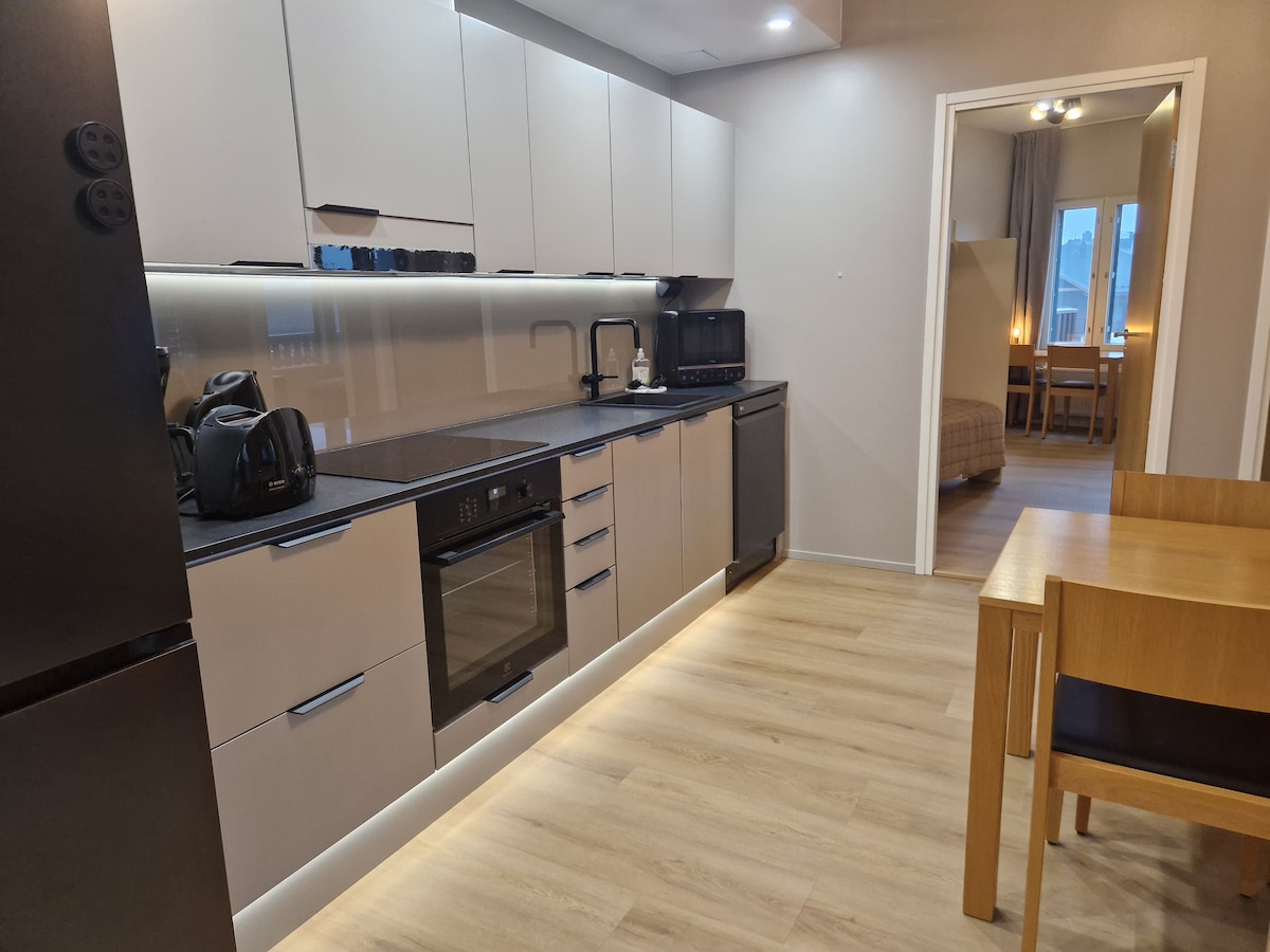 位于库萨莫市中心的舒适两室公寓,带桑拿房