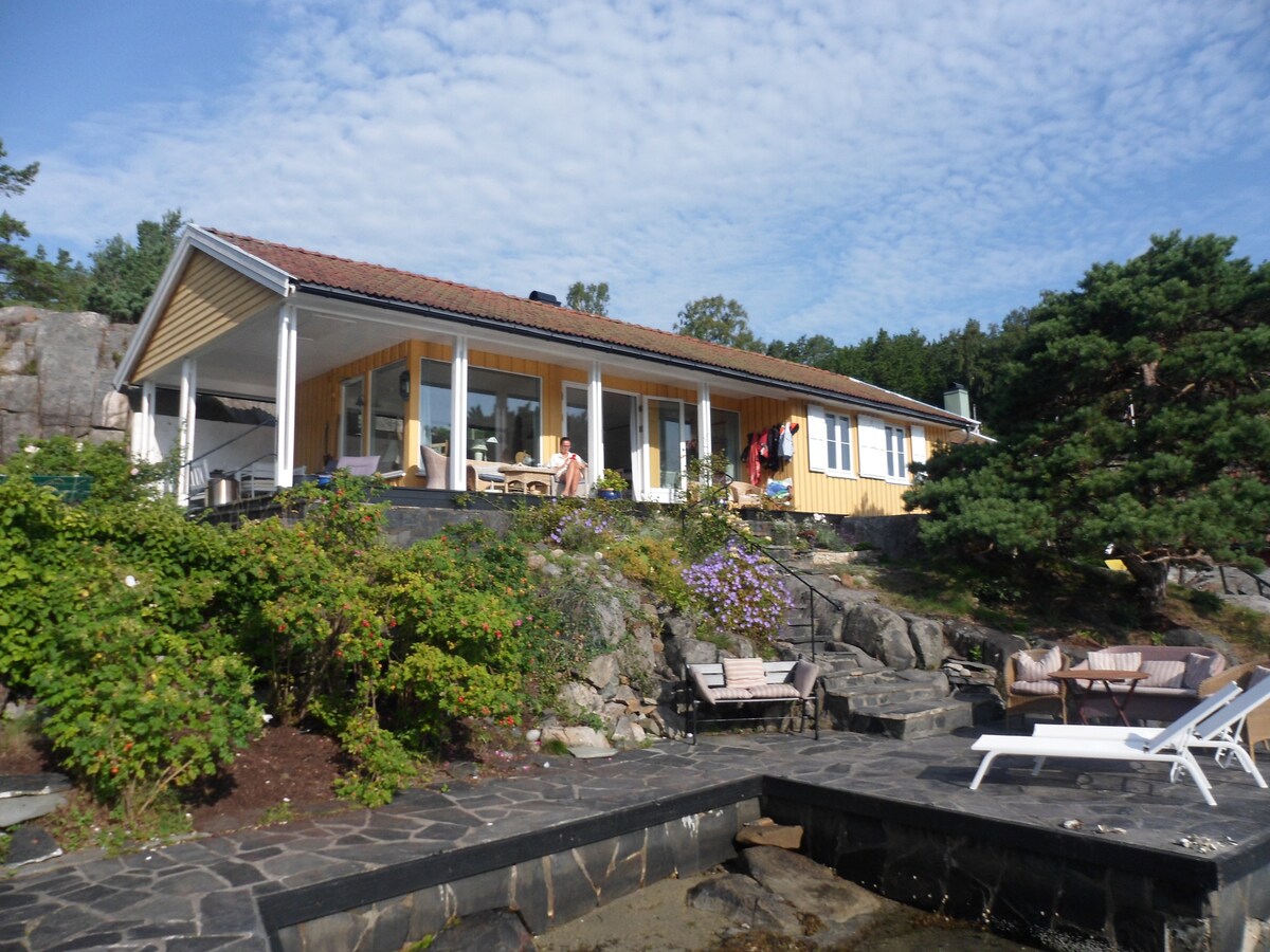 Stort hus med sjøbu, strand og brygge