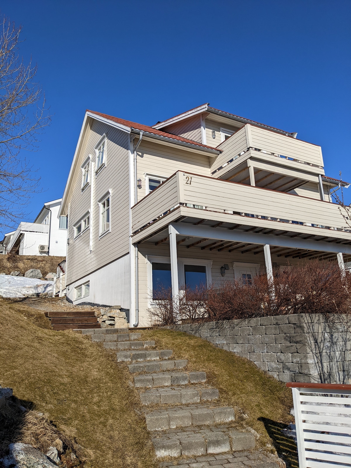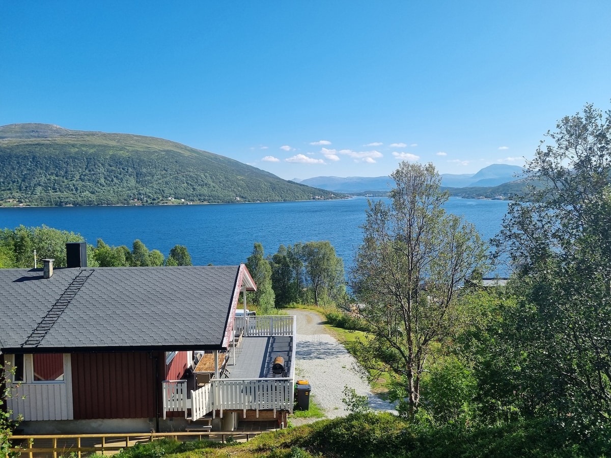 Spectacular new build house (2018) in a lovely, quiet area with a beautiful view to the fjord/sea, mountains and forest in Kvaløya /Tromsø. You can watch the beautiful northern light / aurora borealis from the huge window (10 sqm), sitting in the living room with a cup of tea or coffee in your hand:-) This is a perfect place for tourists who wants to see the northern light, whales in the fjord at winter, hiking/ skiing in the mountains or everything else you want in this lovely city.