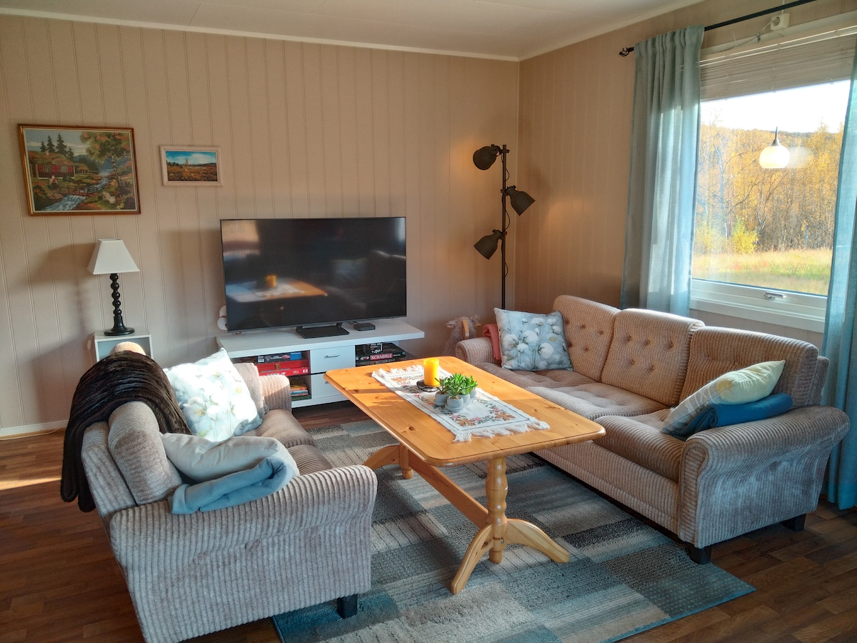 Velkommen til hytta vår, som ligger i et rolig område ved en innsjø. Hytta har en nydelig utsikt, og her er muligheter for å oppleve både nordlyset og midnattssol. Området har varierte muligheter for hiking, friluftsliv og opplevelser hele året. Spør oss gjerne om tips :) OBS! Sovehemsen er åpen, og egner seg ikke for barn. Barn kan bruke soverom, sovesofa i stua, eller en flyttbar gulvmadrass. Hytta har en varmtvannstank på 120 liter, det er varmtvann til 3 - 4 personer.