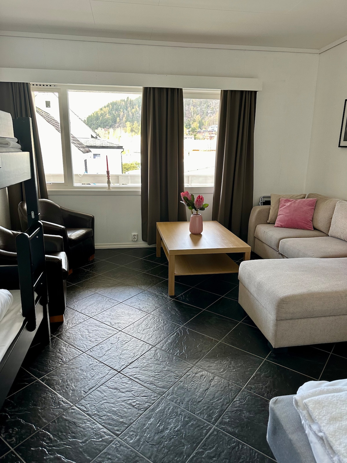 Liten møblert leilighet, (24,4 kvadratmeter)med det du måtte trenge av tallerkner, glass, kopper, bestikk, panner ol. Huset ligger helt ved sjøen , Hardangerfjorden , og bare 1,5 kilometer fra Norheimsund sentrum. Der finner du det meste av dagligvarer, kino, strand, noen Resturanter, frisør osv. Det er mange fine fjellturer rett i nærheten. Det er en liten leilighet, så hvis dere er flere enn to, så kan det bli trangt.