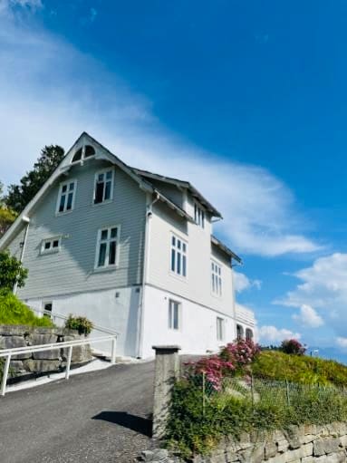 Charming, classic home with an idyllic location by the fjord. Centrally located, with just a short walk across the bridge to downtown Norheimsund. You'll get the view of the fjord, mountains and the beautiful Folgefonna glacier. The home has 3 floors with 3 bedrooms, 2 bathrooms, 1 living room and kitchen. Explore Hardanger from here, going hiking, swimming in the fjord or just relaxing. In winter we recommend skiing at Kvamskogen or Sjusete close by. WIFI & Google TV available