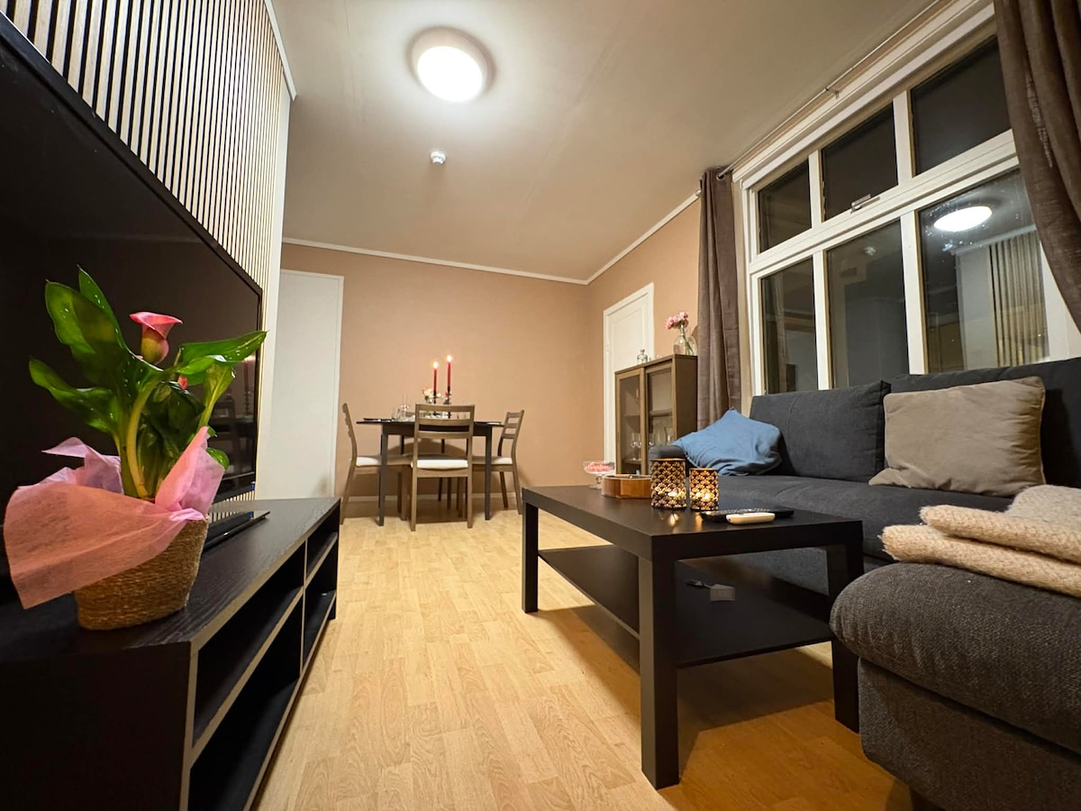 Liten møblert leilighet, (24,4 kvadratmeter)med det du måtte trenge av tallerkner, glass, kopper, bestikk, panner ol. Huset ligger helt ved sjøen , Hardangerfjorden , og bare 1,5 kilometer fra Norheimsund sentrum. Der finner du det meste av dagligvarer, kino, strand, noen Resturanter, frisør osv. Det er mange fine fjellturer rett i nærheten. Det er en liten leilighet, så hvis dere er flere enn to, så kan det bli trangt.