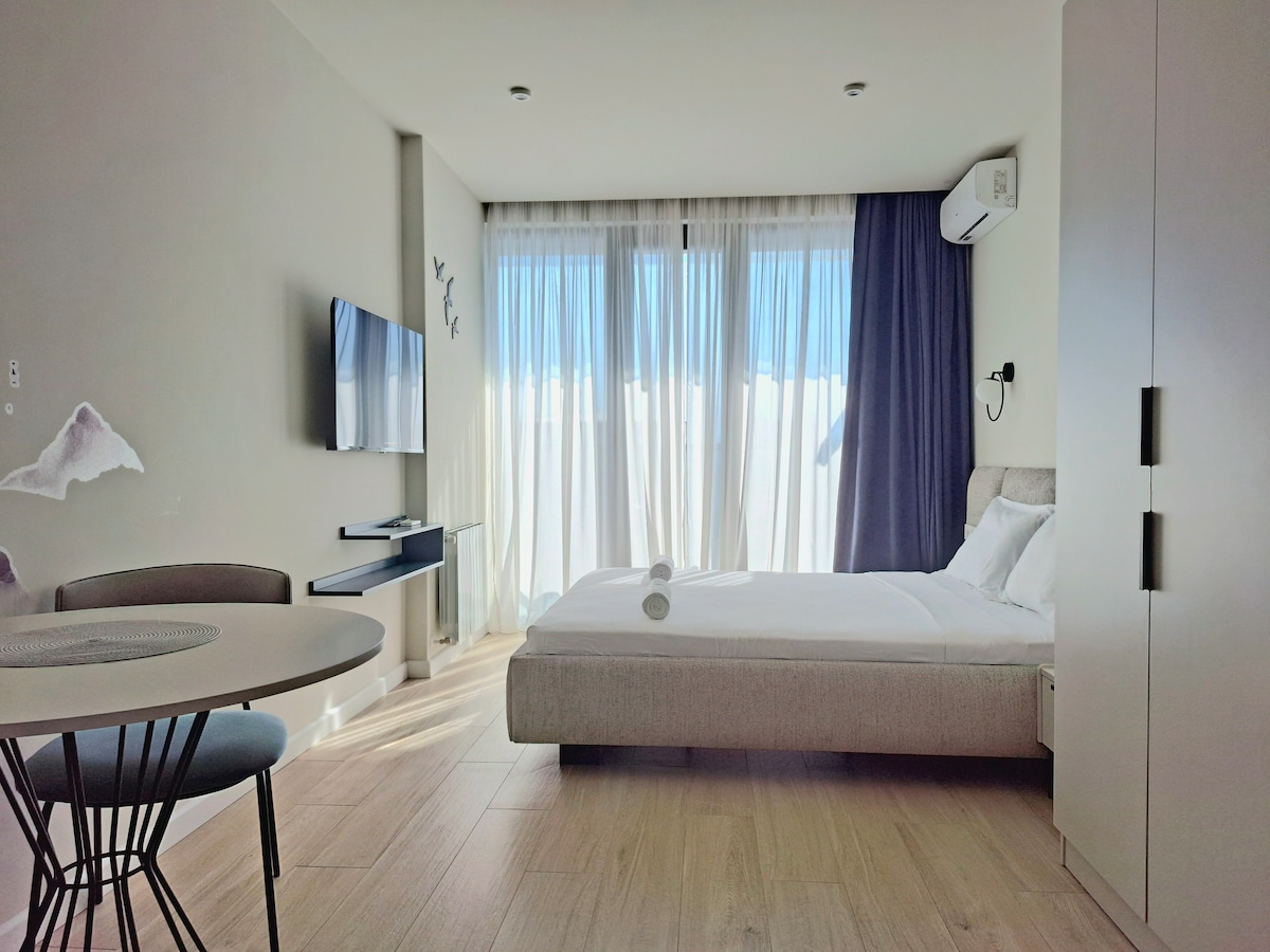 Студия в стиле бохо в историческом центре Батуми — Porta Batumi Tower 🌅 Панорамные окна с захватывающим видом на море, горы и город - Ванна! - Идеальная чистота и свежесть! - Отличная звукоизоляция! - Тёплые полы в ванной! - Много лифтов, все работают без задержек 📍 Рядом: 🏖 Море — в 2 минутах ходьбы, бульвар прямо у дома 🏛 Старый город, площадь Европы, рестораны и кафе — всего в 5 минутах 🛒 Рядом супермаркеты, аптеки, транспорт, кальянные и бары 🚘 Удобная парковка возле дома