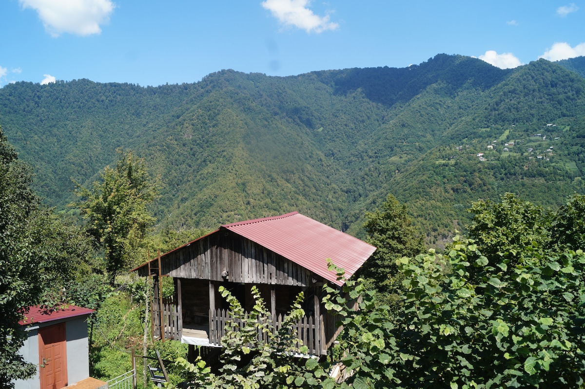 Relax alone, with the whole family or bunch of friends at this peaceful place to stay, enjoy time with your siblings, friends or meditate in your own world. Isolated, high ceiling Cabin - Cottage is unique to dive into your comfort zone with incredible views of protected area of Mountainous Adjara, only 45 minutes from Batumi, with elevation of 450 meters. Perfect for couple or for couple with kids, plus additional hostel type old wooden house next to cottage with few additional beds.