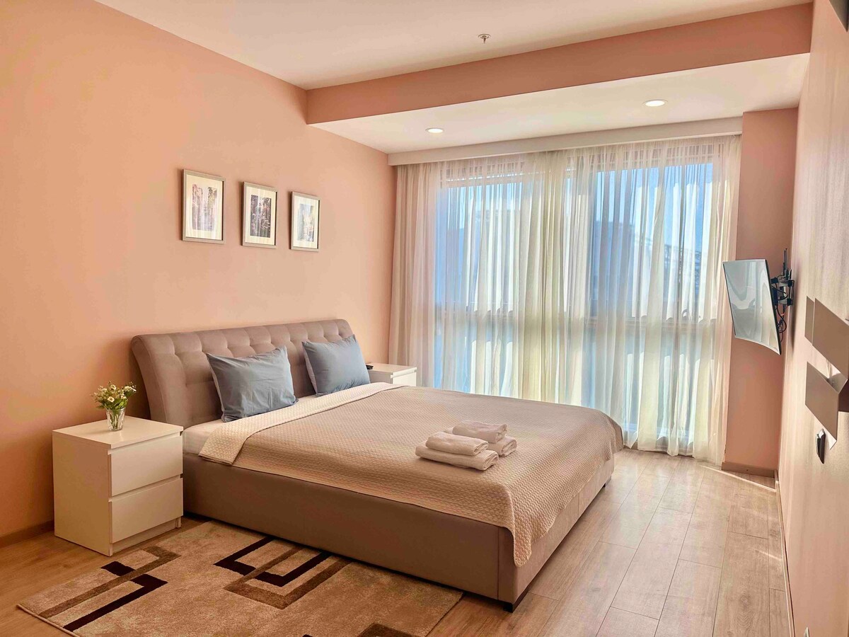 Stylish, clean apartment on the 27th floor in Orbi Block C! Get a 40% discount for stays of 28 or more nights. Utilities included. No extra fees! Free Wi-Fi. 24-hour security and reception! Contactless check-in! Your card is in the mini-safe on the door. Block A, on the 40th floor, features a panoramic restaurant with amazing breakfasts for 30 gel per person! 5-minute walk to the fitness club, swimming pool, and sauna. 2-minute walk to the beach!