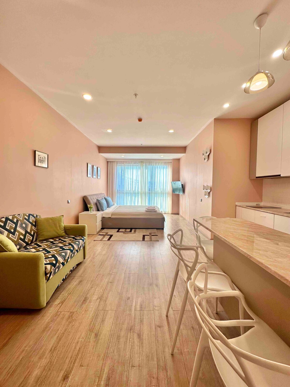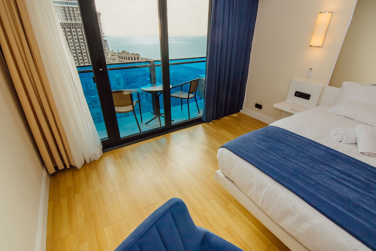 Stylish, clean apartment on the 27th floor in Orbi Block C! Get a 40% discount for stays of 28 or more nights. Utilities included. No extra fees! Free Wi-Fi. 24-hour security and reception! Contactless check-in! Your card is in the mini-safe on the door. Block A, on the 40th floor, features a panoramic restaurant with amazing breakfasts for 30 gel per person! 5-minute walk to the fitness club, swimming pool, and sauna. 2-minute walk to the beach!