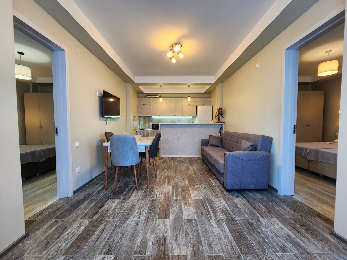 Welcome to our cabin Greenland Pheria, where rural atmosphere meets comfort in the vibrant heart of nature. This bright and stylish cabin offers stunning sea and mountain views from your private balcony and bay windows, just a stone's throw away from city of Batumi. Enjoy the convenience of complimentary air conditioning and Home Theater Projector among other modern amenities.