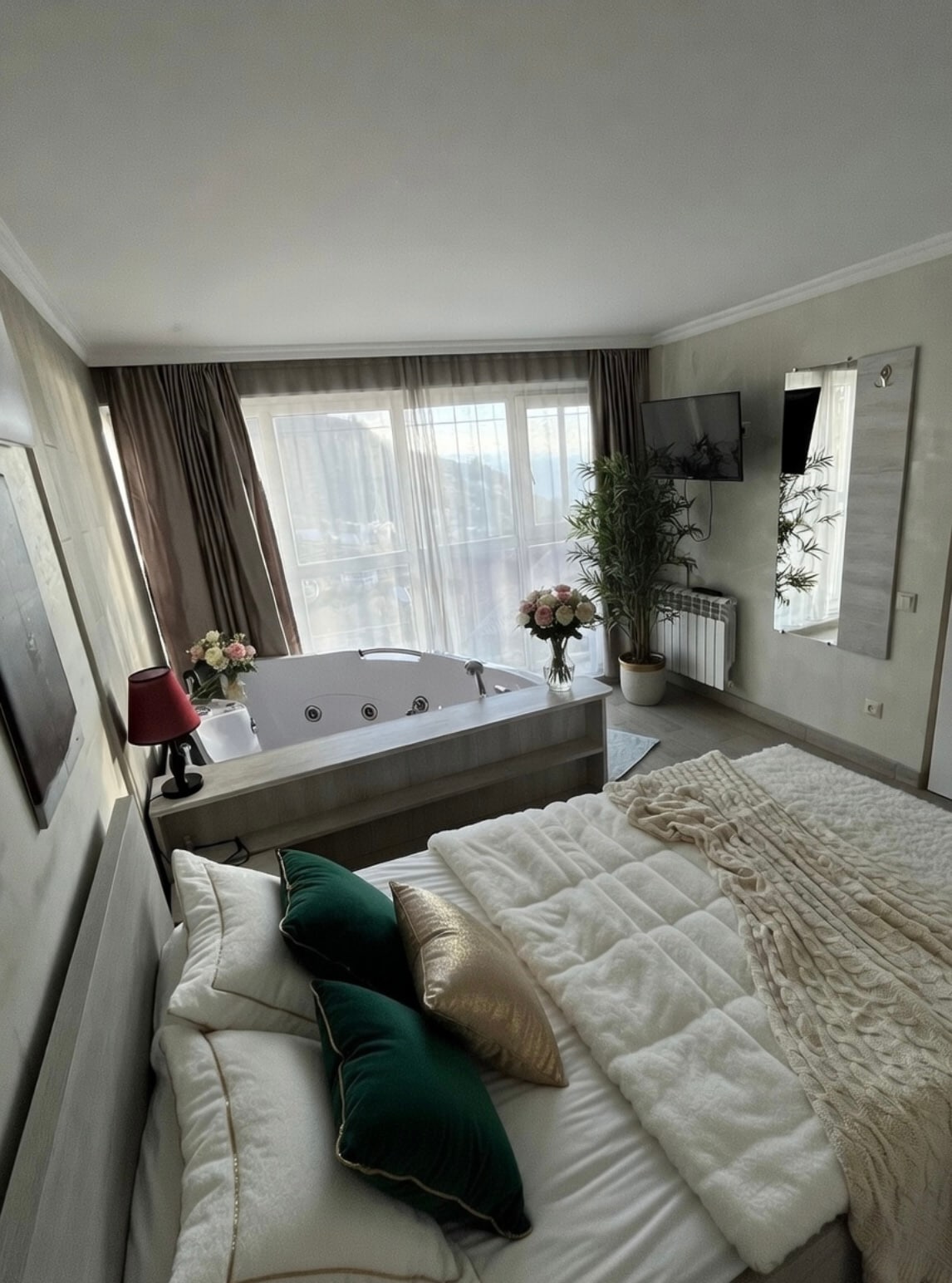 Welcome to the ART apartment with a unique atmosphere! Luxury, style, and art — all in one place! A jacuzzi on the balcony with views of the city and mountains, surrounded by tropical plants, creates a secluded paradise. The rock-shaped bed, crafted by sculptors, is one of a kind, complemented by a stunning 4x2 meter mural. The dark tones of the interior set a romantic mood. Just 200 meters to the beach, and 100 meters to the mall! Perfect for relaxation and inspiration.