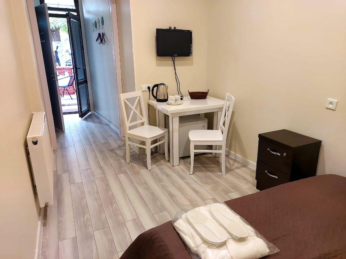 Новые комнаты гостиничного типа в самом центре города. С ванной. Есть маленький холодильник, чайник, фен. Нет кухни. Smart TV, fast Internet Можно пользоваться со стиральной машиной с сушилкой. Отсюда можете добраться пешком до все достопримечательные места Тбилиси. Вокруг много модных кафе ресторанов и бары, банки, супермаркеты, салоны красоты… на против замечательный Wine factory
