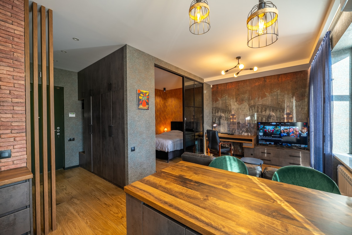 INDUSTRIAL Studio in old soviet building designed by "VIRSTAK", brings unique atmosphere with spectacular day and night CITY VIEW enjoyable from the BATHTUB. -100% HANDMADE. - Not a RANDOM cozy/ functional apartment, Studios amenities consists of old vintage and industrial furniture, for some people might feel uncomfortable out coming from a personal taste. Artistic vibe making you feel like in movies. - WINERY - 9 SORTS of wine - Movie Projector Airport pickup Suzuki Swift 80 Gel