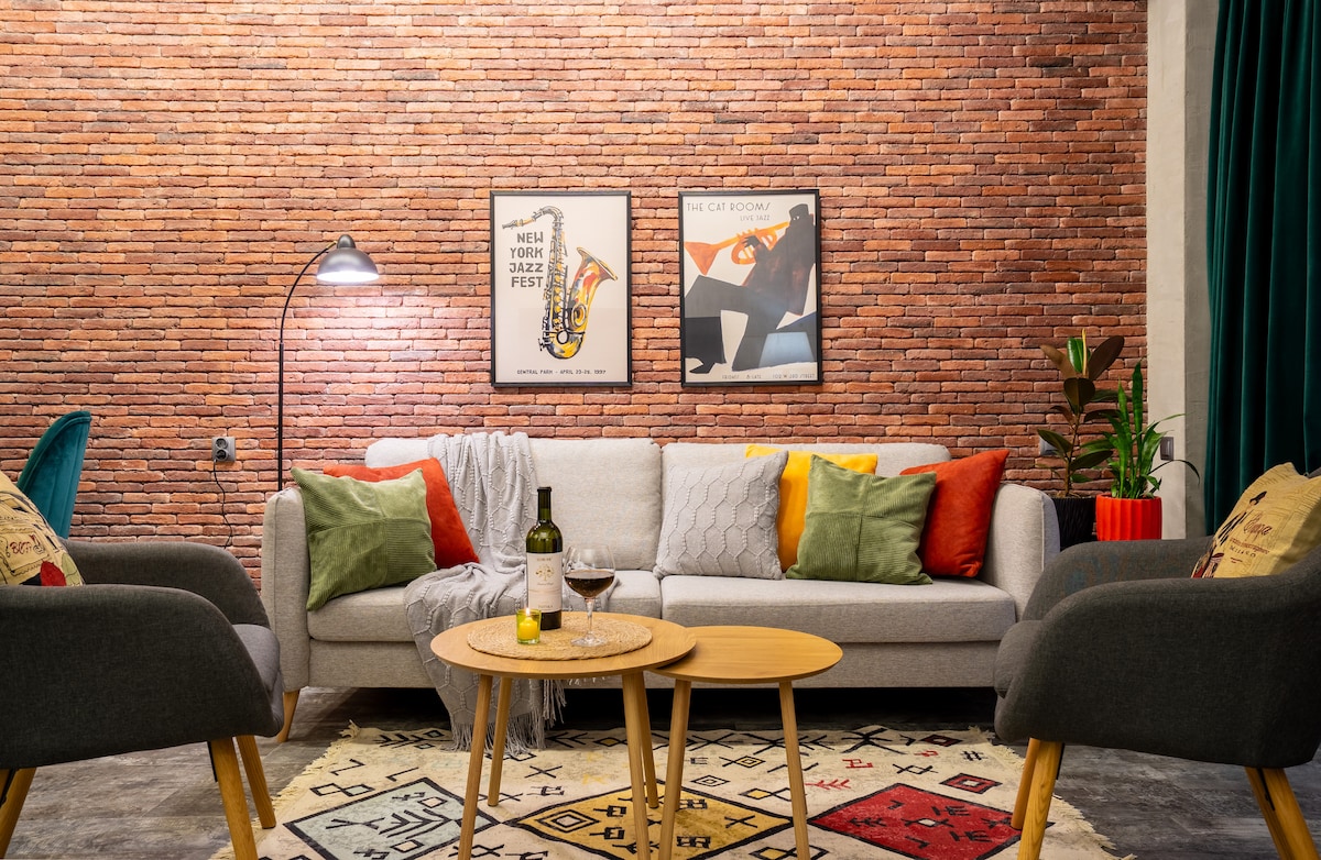 Located in Tbilisi’s prestigious central district. AIR CONDITIONING HAS BEEN ADDED IN THE BEDROOM. Set in a new luxury building in the cozy Round Garden area, this stylish loft combines vintage and urban design with a peaceful atmosphere. Perfect for working remotely — fast Wi-Fi, natural light, and a calm, inspiring space also for long stays or family trips.
