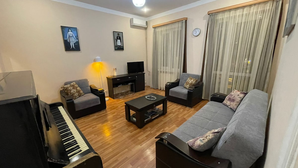 Abanotubani is a historic part of Old Tbilisi with famous functional ancient Sulfuric Baths in the middle. After been restored it became a major tourist attraction. The apartment is on 3rd floor, backstreet ground level entry, with balcony view on Sulfuric Baths square and century old trees. It includes Leaving room, Bedroom, Hallway, Equipped Kitchen, WiFi, TV, Balcony and Piano. The rest of Old Tbilisi, Downtown, Subway, Classy Restaurants and Cafes, they all are within walking distance.