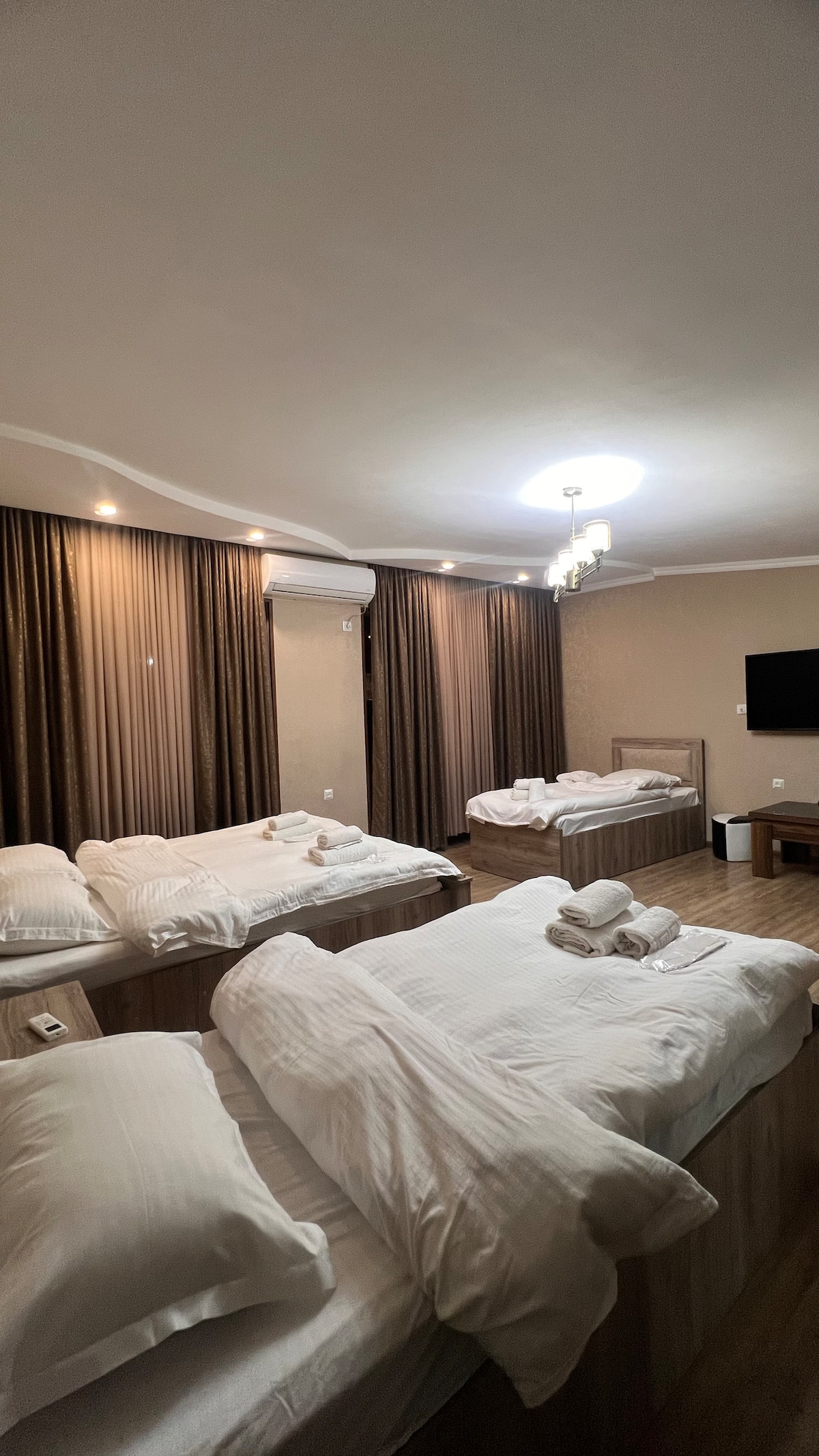 Bright room with two queen beds, ideal for small families or groups of four. Includes a private bathroom with a walk-in shower, free Wi-Fi, TV, safe, mini fridge, and an electric kettle with coffee and tea. Fresh towels, bed sheets, and toiletries provided. Shared kitchenette and co-working space available. This room faces the rear side of the building. Located in central Vake. Contactless check-in/out