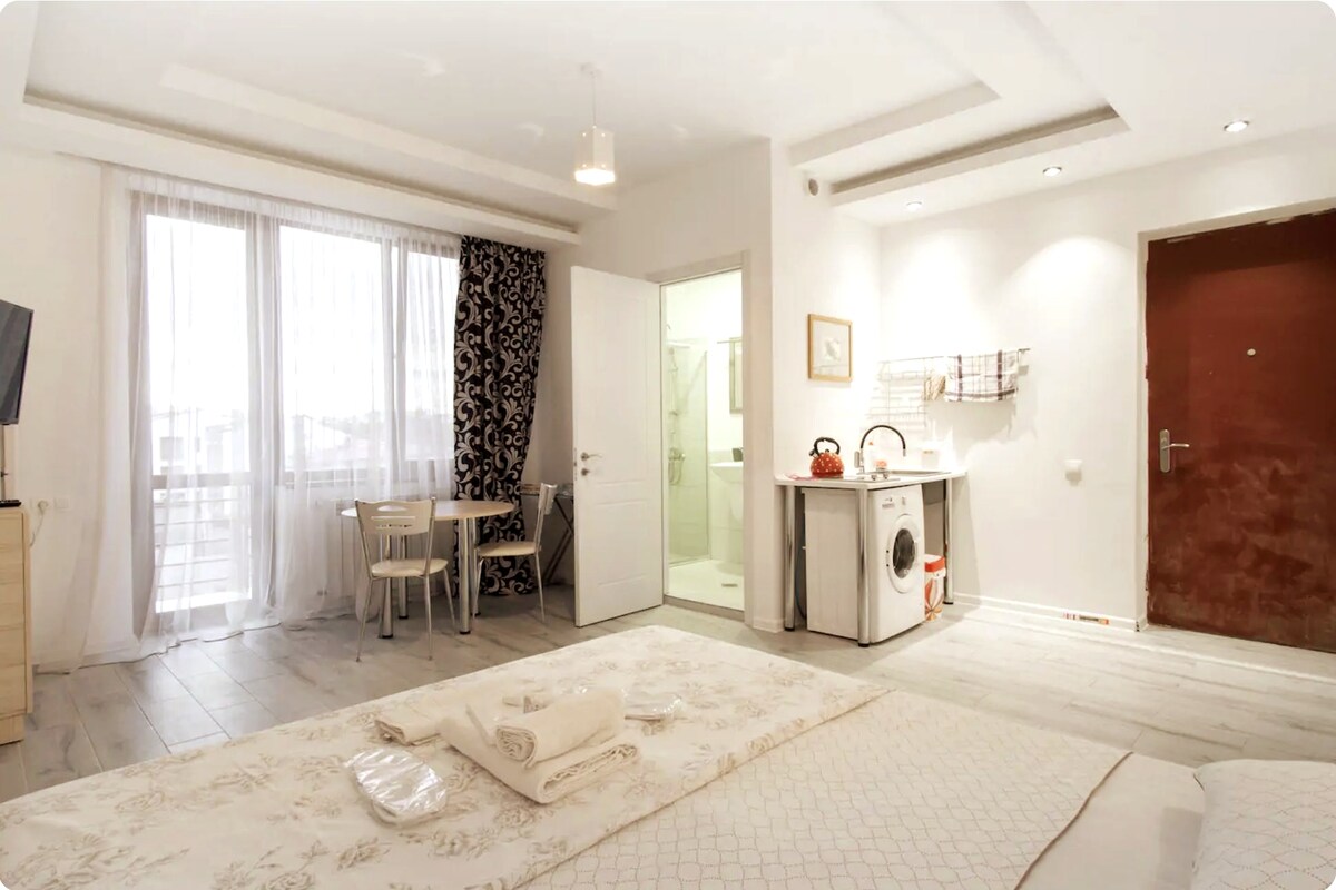 INDUSTRIAL Studio in old soviet building designed by "VIRSTAK", brings unique atmosphere with spectacular day and night CITY VIEW enjoyable from the BATHTUB. -100% HANDMADE. - Not a RANDOM cozy/ functional apartment, Studios amenities consists of old vintage and industrial furniture, for some people might feel uncomfortable out coming from a personal taste. Artistic vibe making you feel like in movies. - WINERY - 9 SORTS of wine - Movie Projector Airport pickup Suzuki Swift 80 Gel