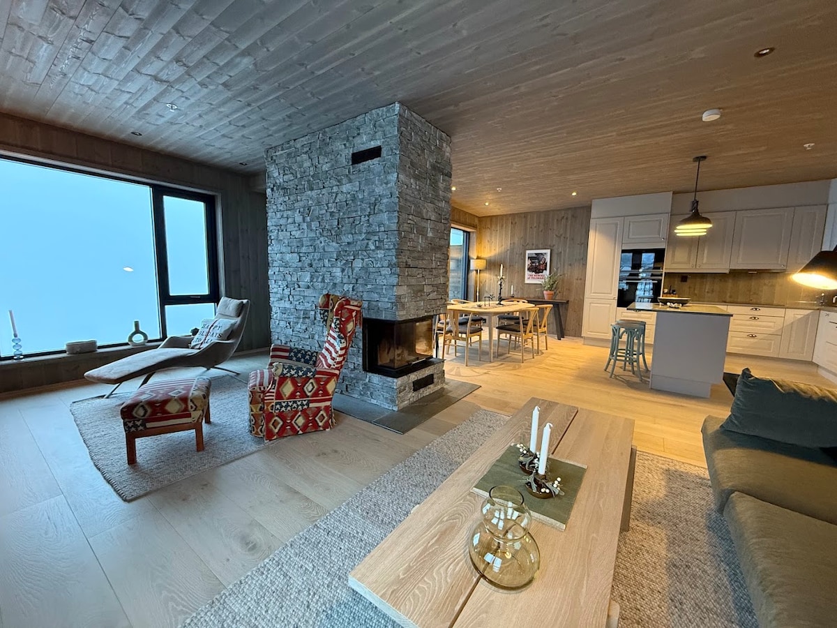 Flott leilighet med gode materialvalg. Stue med hyggelig spisebord ,sofaavdeling, skjenk og hyggelig peis. Velutstyrt kjøkken, og alle fasiliteter. 2 delikate soverom med dobbeltsenger, og flislagt bad med dusj og vaskemaskin. Tv og Sonos anlegg, og alle muligheter for en herlig tid på fjellet i flotte omgivelser. Fin veranda med nydelig utsikt. Må ta med eget håndklær, sengetøy og ved til peis. Solskjerming i stue,ellers fritt for gardiner pga fantastisk utsikt fra soverommene.