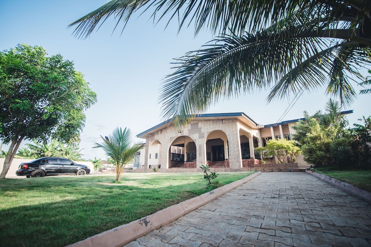 Welcome to the Banahene Residence! Our fully furnished 200 m² house features three bedrooms - each with a bathroom - comfortably accommodating up to five guests. Enjoy air conditioning and ceiling fans in every room, as well as a fully equipped kitchen for all your cooking needs. Our house is equipped with a video doorbell and electric security fence for your safety and peace of mind. - Breakfast and dinner service available - Airport shuttle on demand - Generator available