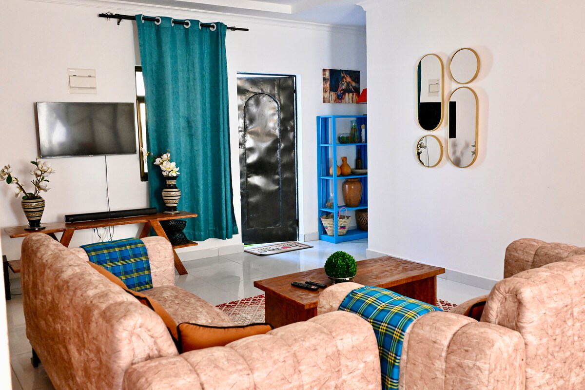 It's a Modern one bedroom apartment, situated in the leafy suburbs of Nyali Area. The apartment is easily accessible by public transport, taxis, tuktuk etc. The apartment offers a free and secure parking with both a 24hour security guards. It's ideal for both business and holiday travellers.