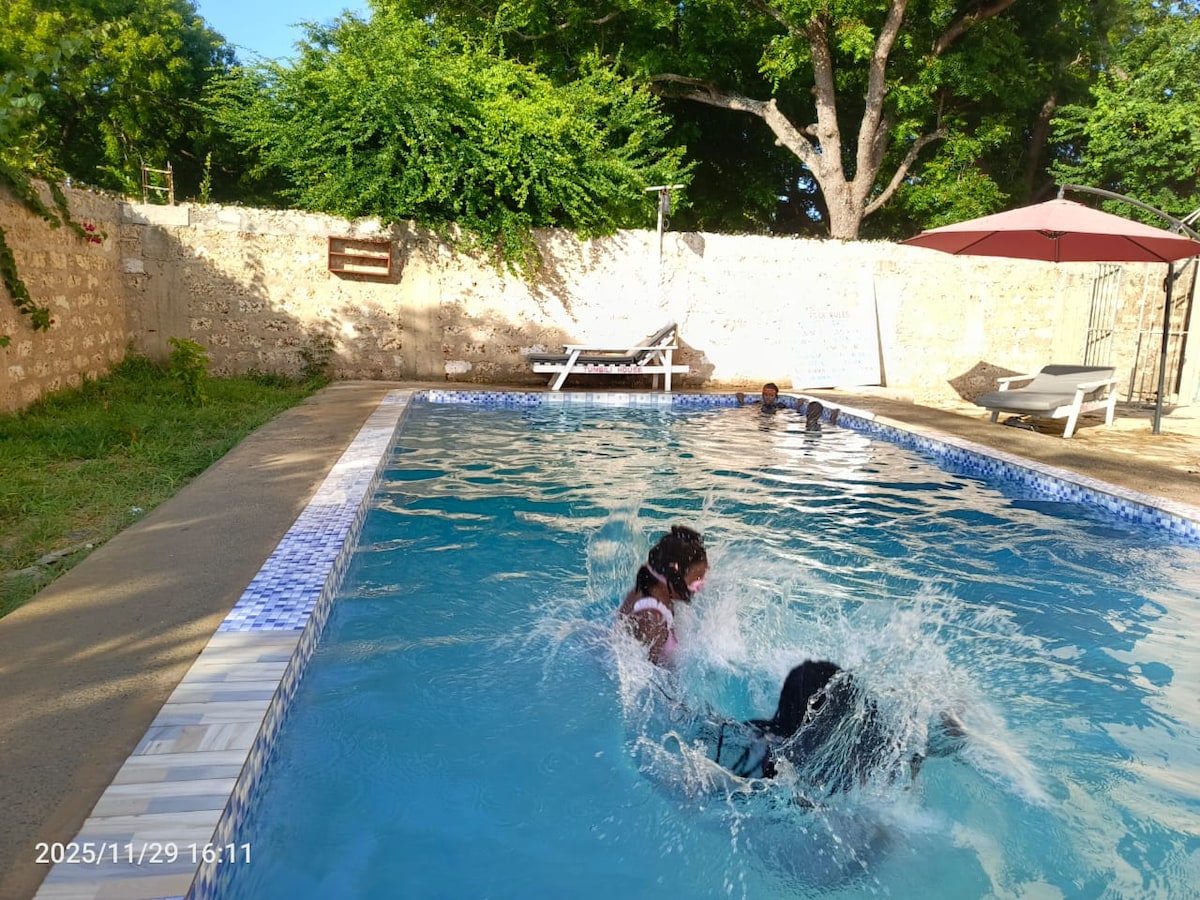 AC available in all rooms which are en-suite Private,Peaceful and quiet, great for individuals as well as families 5 Min walk to naivas and carrefour 3 mins walk to the beach Wheelchair Friendly Outsdoor BBQ Chef available Restaurant available at pocket friendly prices, everything from local food to sea food (charged separately) Free and fast WI-FI Queen size beds Free parking Hot water available Swimming pool Individual rooms available for booking Additional Mattress available