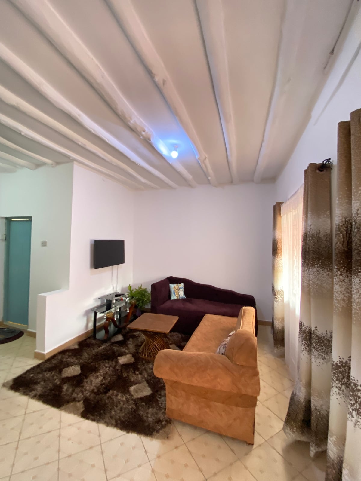 A simple, less is more interior decor 1bedroom house in Central Diani. Spacious, bright and perfect for short or long stays. A comfortable large sofa bed chair in the living room, flat screen smart TV, fast wifi and a dinning area that can be used as a study/work table. A fully equipped kitchen, queen size bed in the bedroom, a clean bathroom stocked with towels and toiletries. High roof with ceiling fans, extra standing fans, dehumidifier & large louvre glass windows for air circulation.