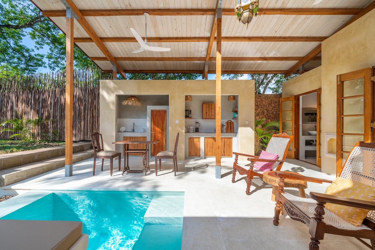 Nestled on a private property shaded by indigenous trees, Monkey Suites offers exclusive beach access just a one-minute walk away. The Vervet Suite is one of two self-catering residences, a serene one-bedroom retreat with a private pool and garden. Inside, enjoy air-conditioned comfort; outside, relax under the trees, with ocean breezes and playful monkeys for company. Breakfast is available at an additional cost. A peaceful blend of privacy, comfort, and barefoot luxury.