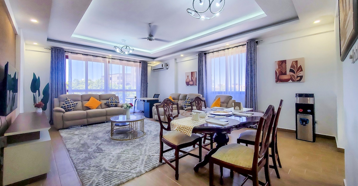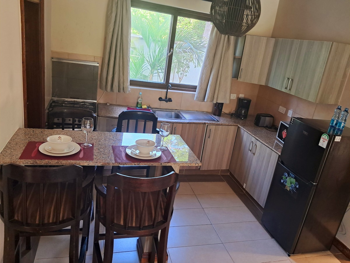 A cozy serviced studio apartment (Bamburi) furnished *Suitable for 2 adults and 1 child or 3 adults, furnished with a queen size bed and a single bed *Daily cleaning included *Dining table with four chairs, sofa, coffee table *AC *TV *Lock up safe *Balcony-two chairs, coffee table *Kitchen - fridge, microwave, kettle, coffee maker, toaster, crockery, cutlery *Access to amenities - pool, kids play area, beach bar, restaurant, gym, beach, laundry *21 km from Moi Int airport *26km from SGR Mombasa