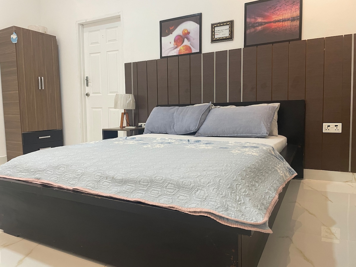 Naabou is not just an ordinary apartment. It is an airconditioned private space with a homely touch .It is fully furnished with a cosy King-size bed with a 55 inch smart smart Tv, dining area for two,well furnished kitchen,neat bathroom with a sizable gated compound with pergola with cane furniture for your relaxation, comfort and privacy. It is ideal place for couples and business persons and a generator to take care of power interruption and also washing machine and accessories for laundry
