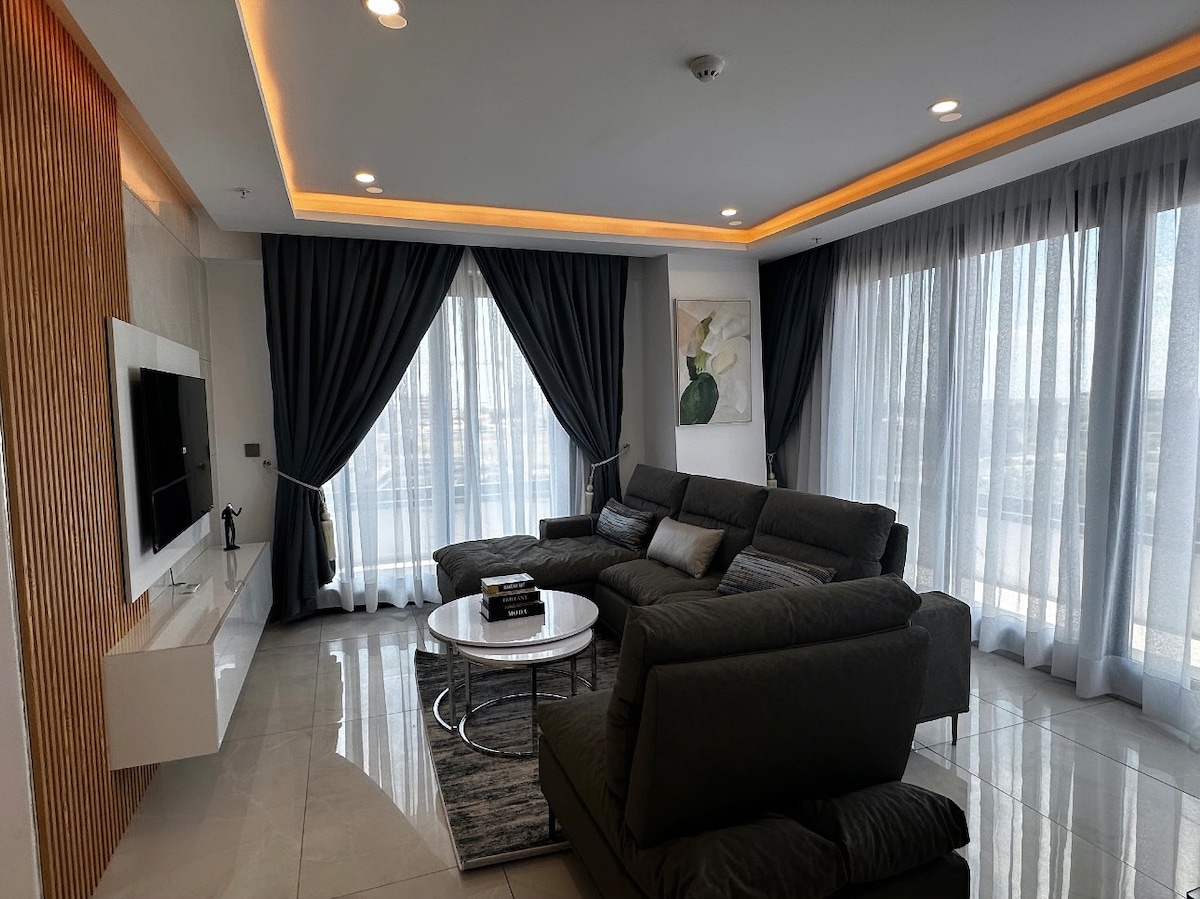 Relax in this stylish three-bedroom apartment at Villagio, Accra. It features a spacious living area, a fully equipped kitchen, and beautiful city views in a serene, secure setting. Centrally located and just a five-minute drive from Kotoka International Airport, with access to a swimming pool and key city attractions nearby, ideal for business or leisure stays.
