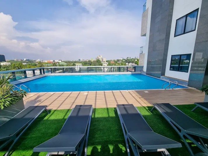 Your extraordinary Accra experience begins here. Book now and see why guests say ‘home away from home only gets better.’ Access to rooftop pool and gym. This stylish unit in Airport Residential offers hotel-level comfort. Enjoy a queen bed, vibrant yellow sofa, smart TV, fast Wi-Fi, cool AC, kitchenette, and a calm balcony. Walk safely to Airport City, restaurants, malls, cafés and Roman Ridge. 5-10 mins drive to airport. Perfect for business travelers, couples, solo guests and weekend escapes