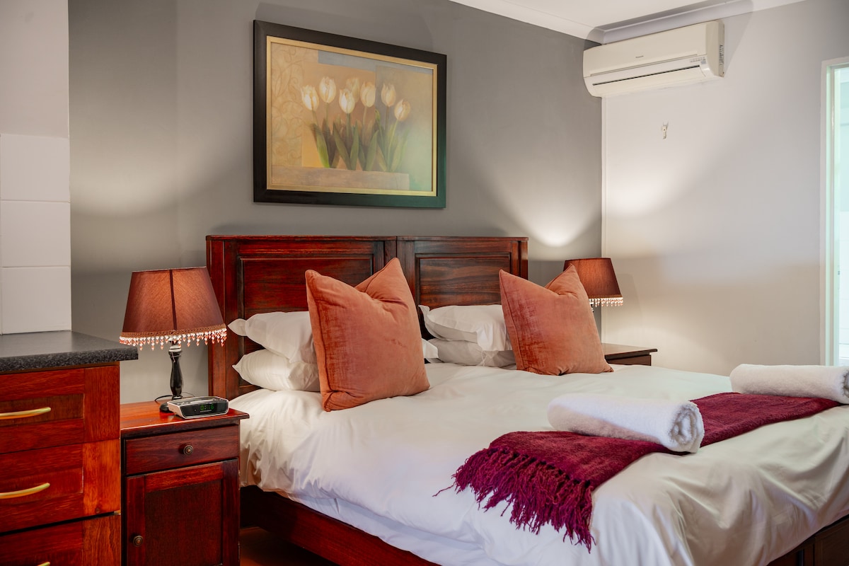 Enjoy the comfort of our elegantly appointed Standard Double Room, featuring an en-suite bathroom and modern amenities. The room is equipped with air conditioning, a cozy fireplace, and access to our hotel bouquet DSTV for entertainment. A convenient kitchenette includes a microwave, kettle, tea, and coffee. Additional touches like a dressing table and standard Wi-Fi ensure a relaxing and functional stay. Perfect for both leisure and business travelers.