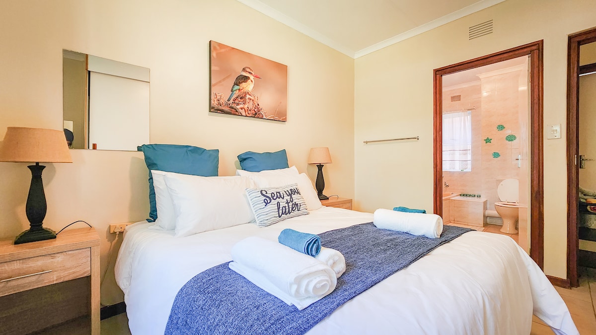 Situated on Scottburgh Beach, our two-storey, coastal self-catering accommodation has breathtaking views of main beach with exclusive direct beach access, a private garden and braai area. The main bedroom features sea views and a large verandah to enjoy a glass of wine as the sun sets or a coffee for the sunrise. Fully equipped kitchen. With four bedrooms, and two bathrooms, the space is ideal for two families (sleeps 9 - 4 adults and 5 children)