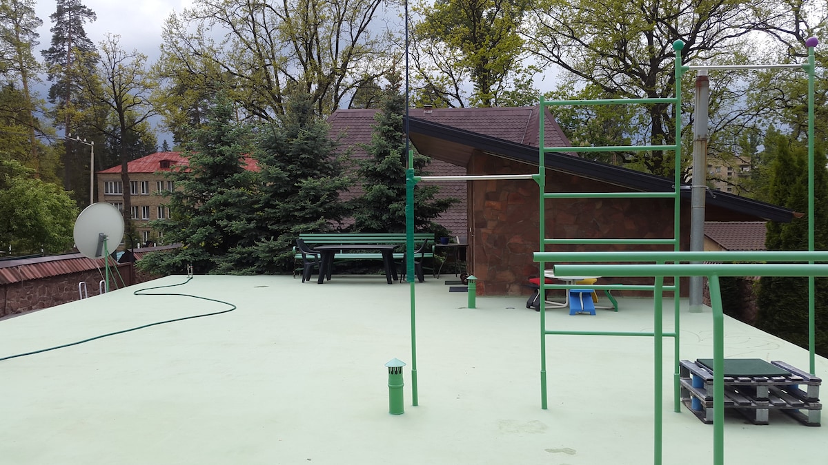 Park Puscha Sauna Deluxe Apartment is 70m2 large with the summer terrace 170m2. Zero Floor is providing Sauna, Shower/WC, Relax White Room with double bad and Italian Leather Sofa bed, dining table, fridge and kitchen necessaries, 3 beanbags, Flat-screen TV with free SatTV, NTV+movies. Terrace 170m2 is providing Grill, Outdoor Table with chairs, matrass for sunbathing, kid’s swimming pool in the summer.